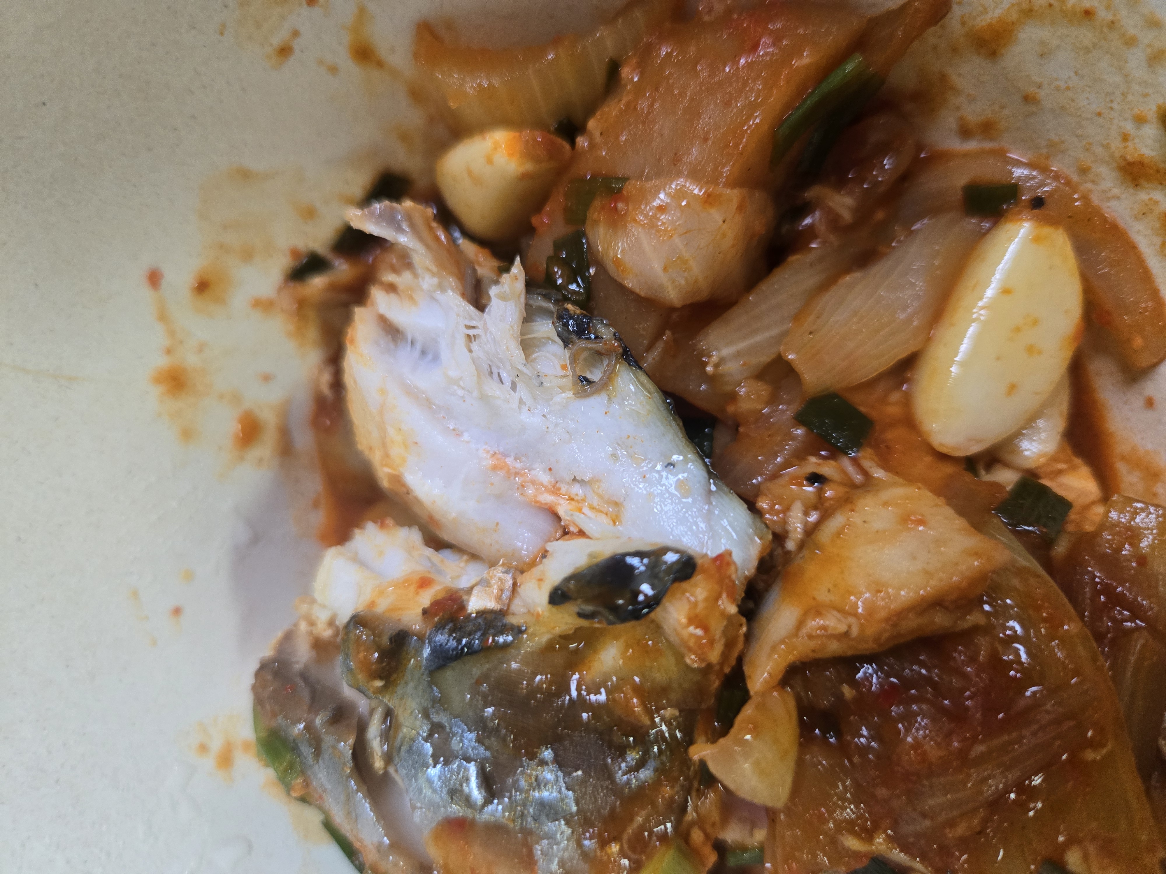 저녁 고등어조림(고등어 300g으로 요리해서 1/3정도 묵으땅)이랑 엄마가 준 밑반찬들 밥은 안묵구 쌈사서 냠냠 + 얼린망고 한개 사과 반쪽 사과사탕 1개